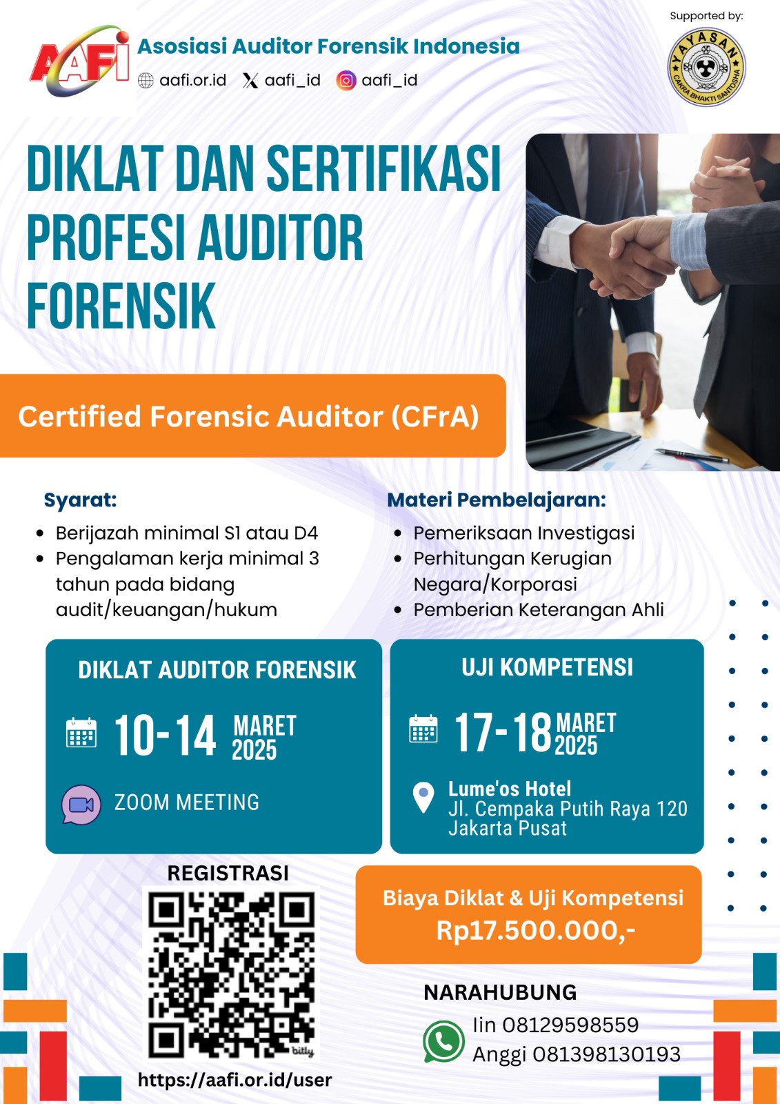 Asosiasi Auditor Forensik Indonesia Sogasio (AAFI SOGASIO), dengan dukungan dari Yayasan Cakra Bhakti Santosha, kembali mengadakan Diklat dan Sertifikasi Profesi Auditor Forensik dengan gelar Certified Forensic Auditor (CFrA). Program ini bertujuan untuk meningkatkan kompetensi para auditor dalam bidang audit investigatif dan forensik guna mendukung upaya pemberantasan tindak pidana keuangan dan korupsi.